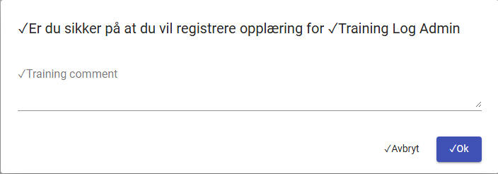 - Du kan legge til en valgfri kommentar med tilleggsinformasjon om opplæringen. Training comment gjøres synlig i Komeptanserapport 6 - Lesestatus for en bruker, Kompetanserapport 7 - Lesestatus for ett dokument, og i Excel-filen som kan hentes ut fra rapportene.